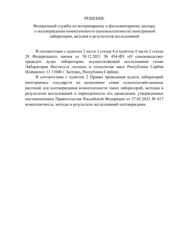 Федерална служба Руске Федерације за ветеринарски и фитосанитарни надзор спровела је поступак потврђивања компетентности страних лабораторија, њихових метода истраживања и резултата, у складу са Федералним законом бр. 454-Ф3 од 30. децембра 2021. године „О производњи семена“.